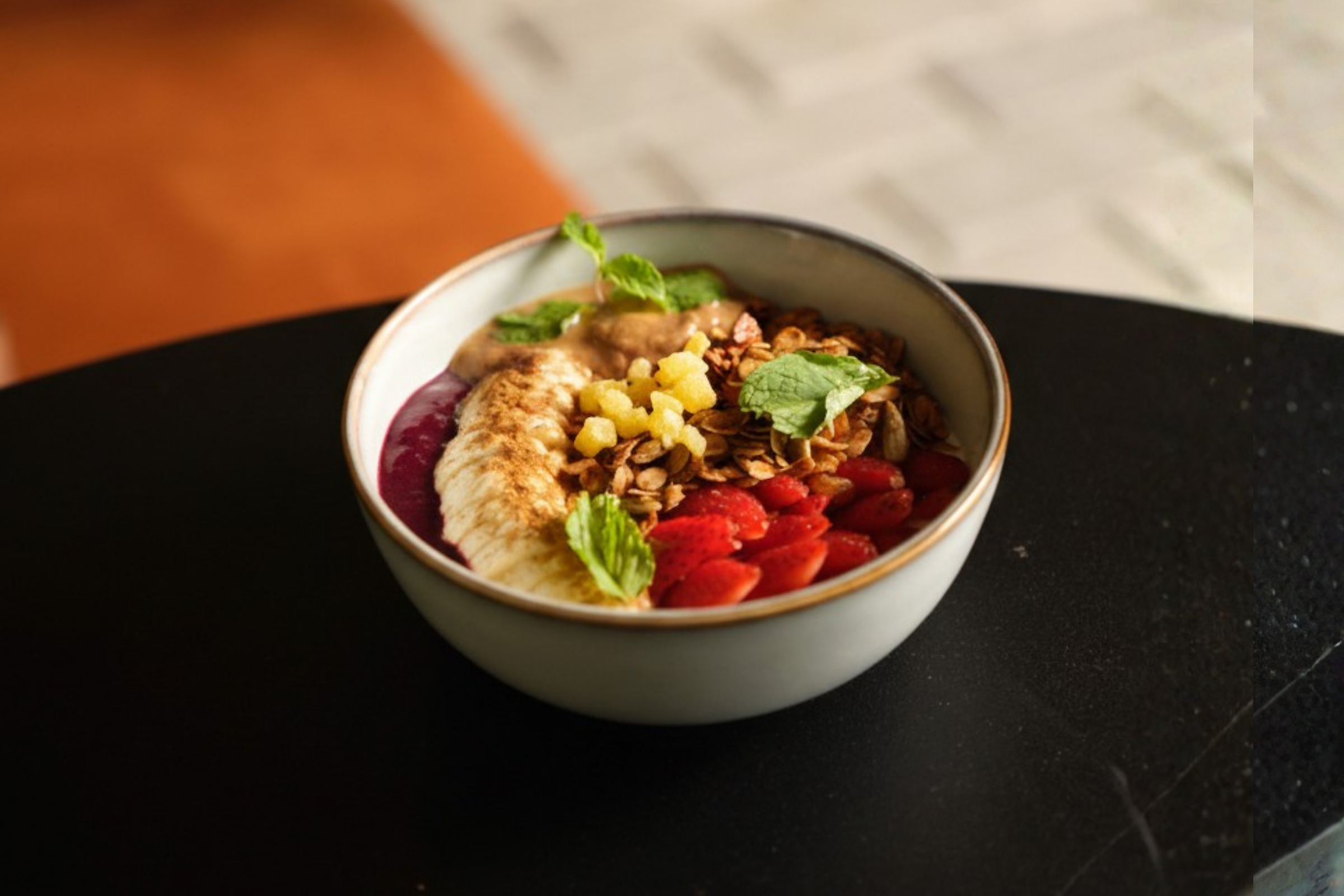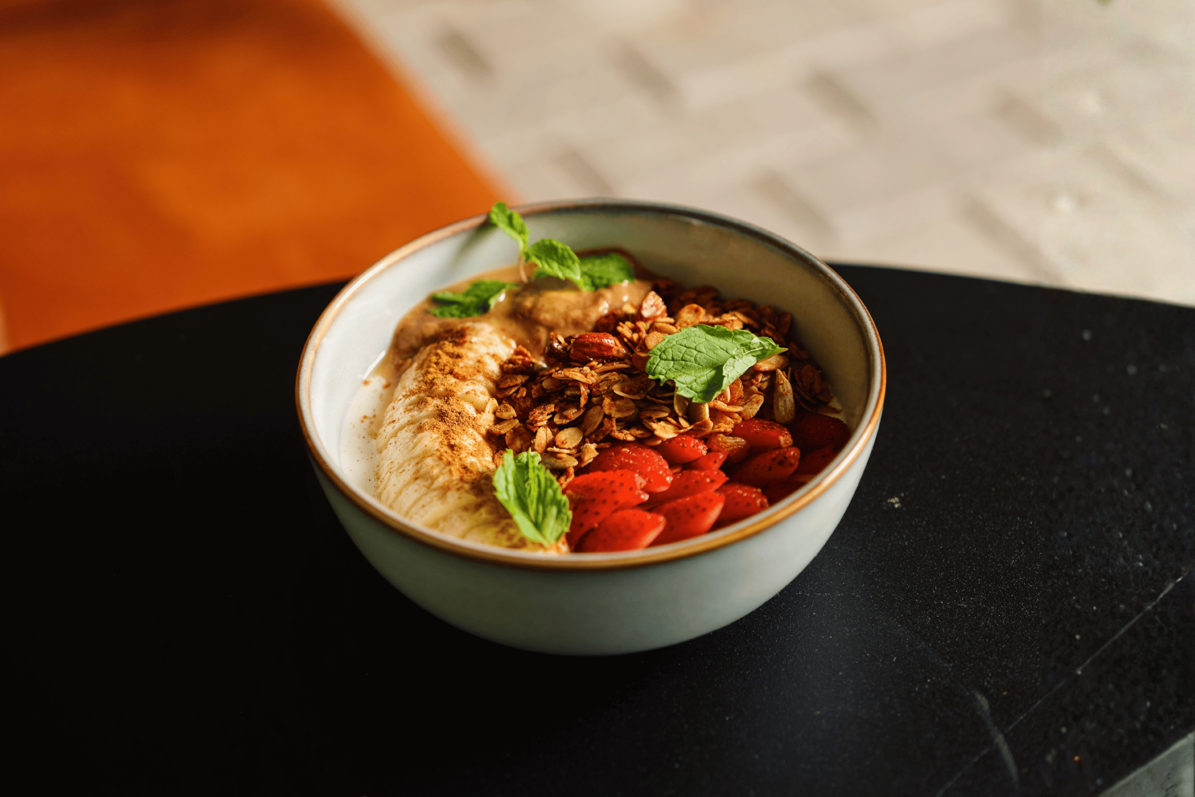 Granola, organic Greek yoghurt, organic peanut butter, strawberries, banana, cinnamon and fresh mint.