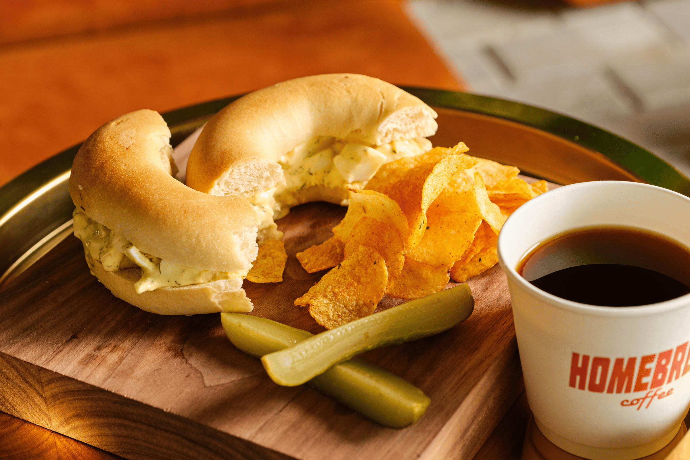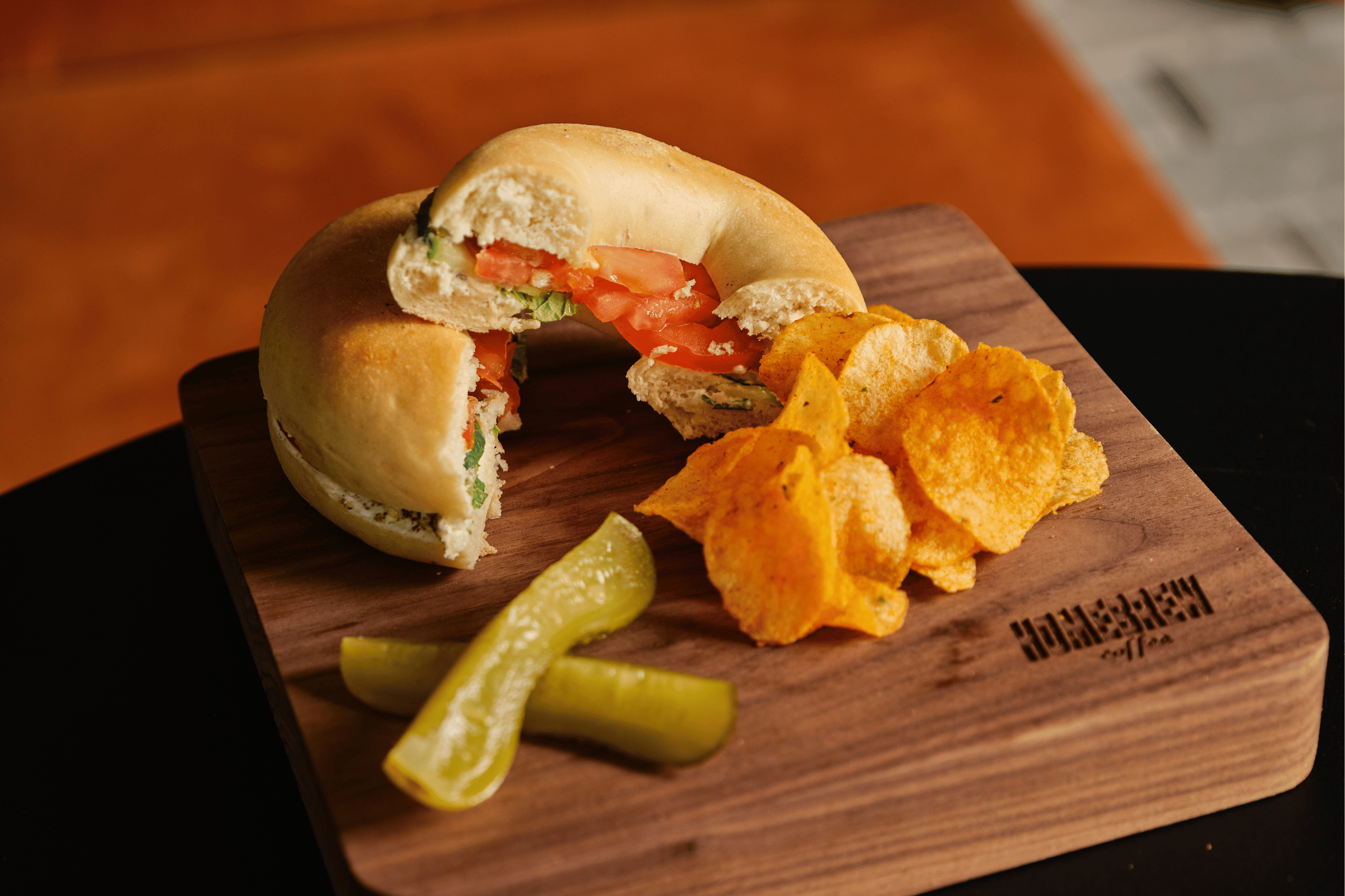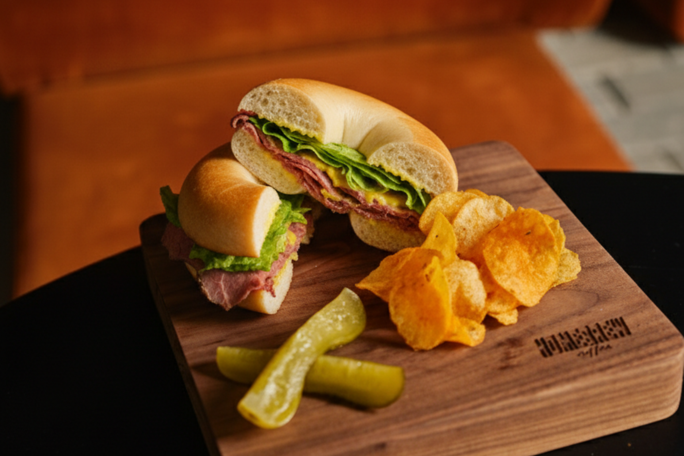 Mustard-mayo sauce, Angus roast beef, homegrown tomato, lollo bionda lettuce, grass-fed butter on sourdough bagel. Served with a side of gherkin and Chips Oman.