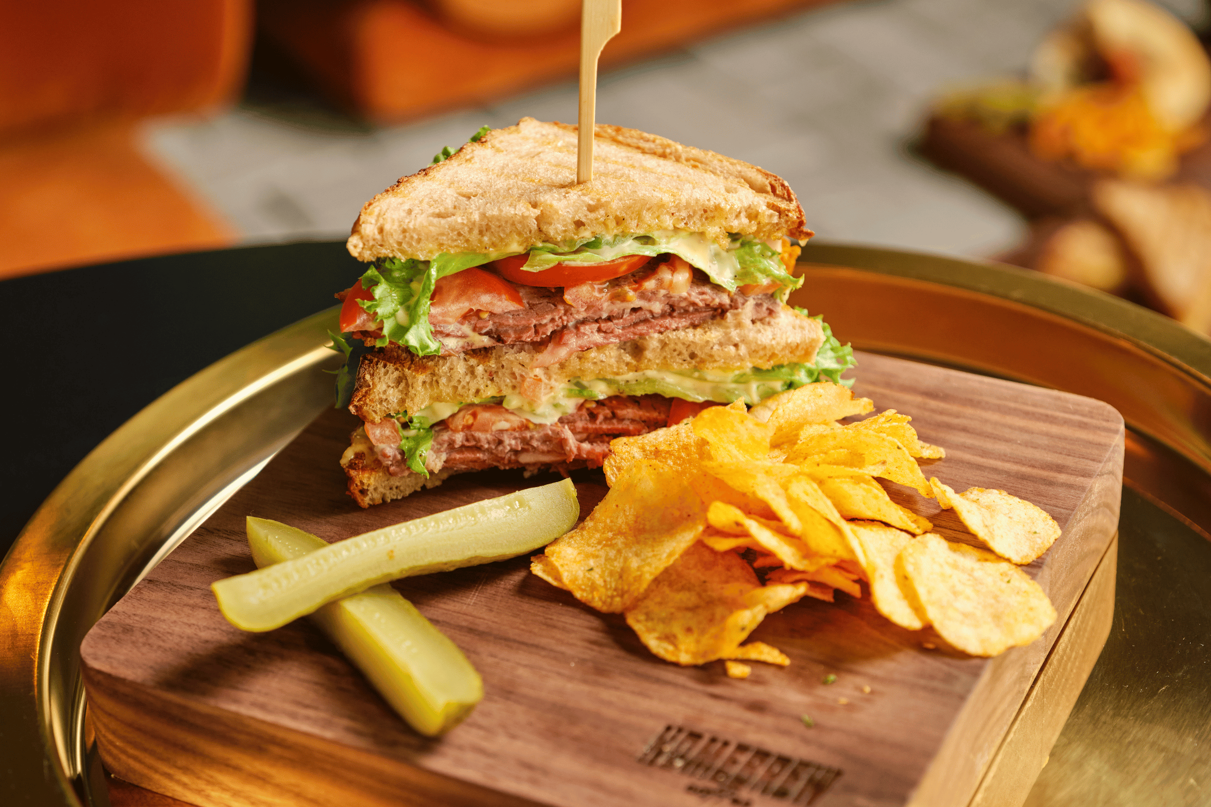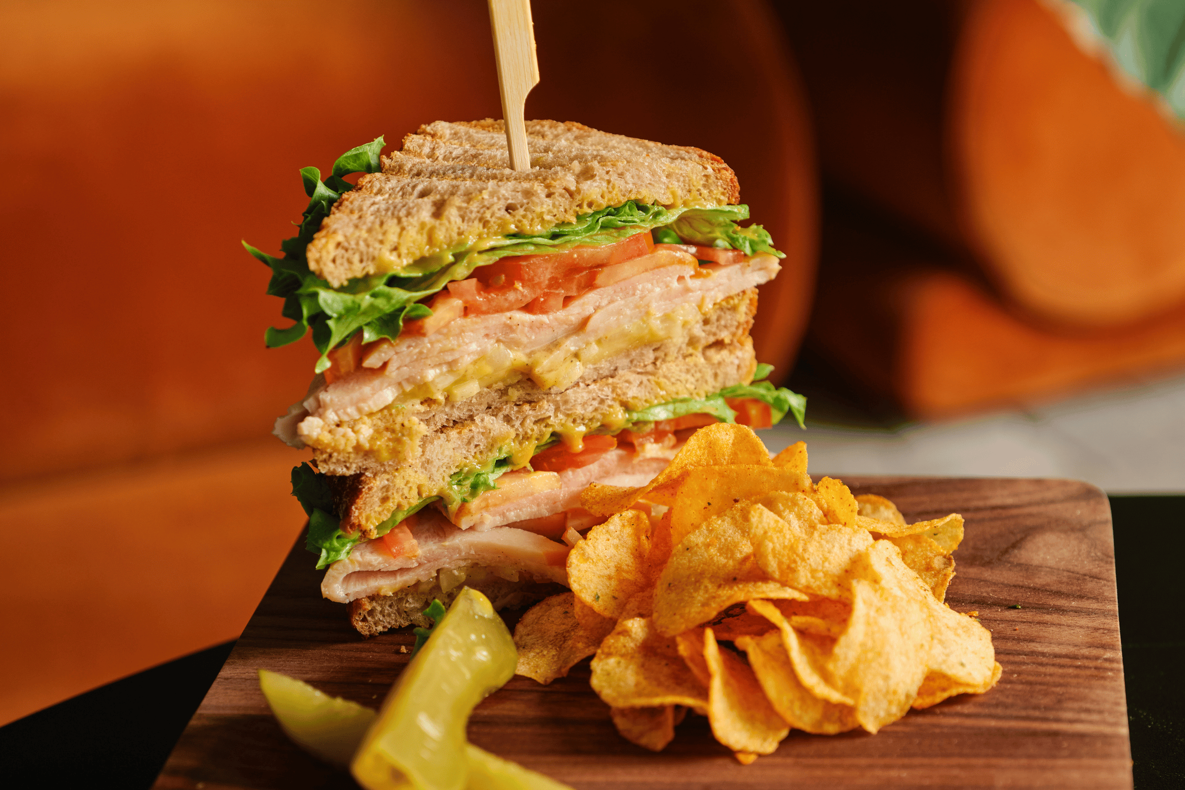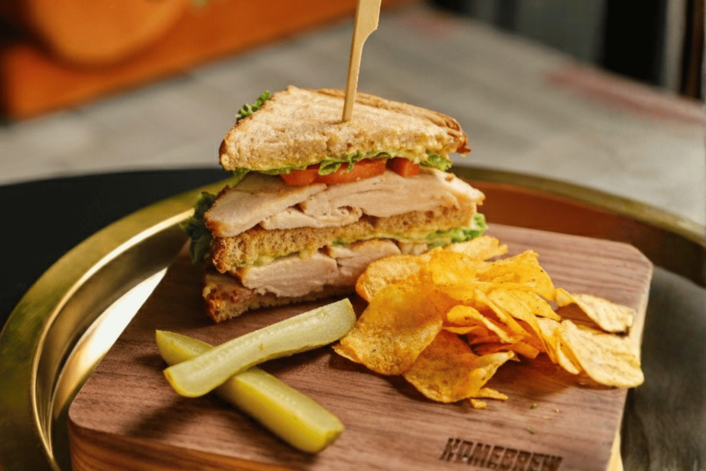 Thick club sandwich with lollo bionda lettuce, avocado, smoked turkey breast, homegrown tomato, fried egg, cheddar cheese and grass-fed butter on sourdough. Served with a side of gherkin and Chips Oman.