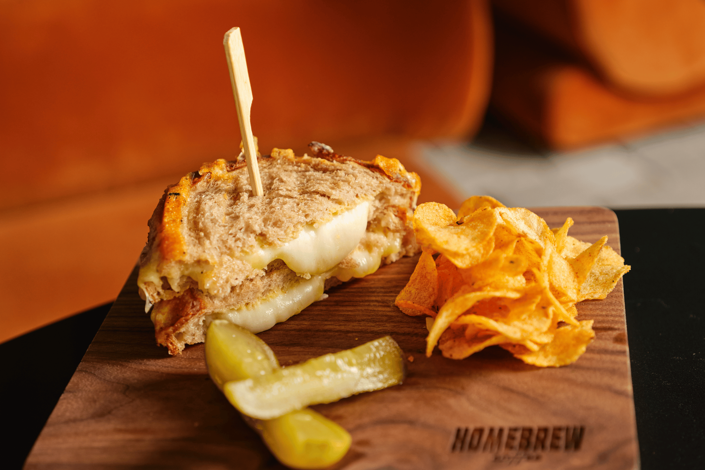 Double cheese toastie with cheddar cheese, mozzarella, grass-fed butter and dijon mustard on sourdough. Served with a side of gherkin and Chips Oman.